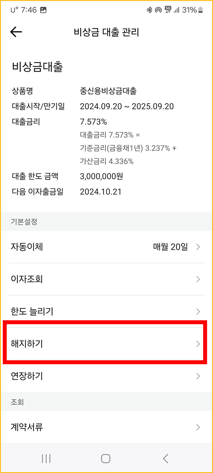 02. 해지하기 밑에 보면 <연장하기>라고 있습니다. 연장하기를 눌러주세요. 연장하기는 만기일로부터 30일 전부터 신청이 가능하며, 모든 사람들이 연장 신청이 가능한 것이 아닙니다. 심사를 통해서 통과한 사람만 연장 신청이 가능하며, 연장을 할 경우 1년의 연장이 됩니다.
