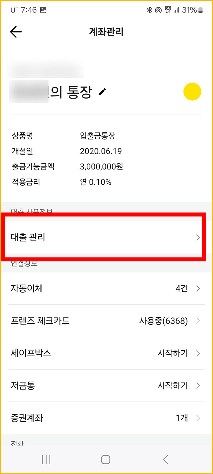 01. <카카오뱅크>에 들어간 다음에 위에서 알려드린 것처럼 <3점>을 눌러주세요. 그리고 <대출 관리>를 눌러주세요.