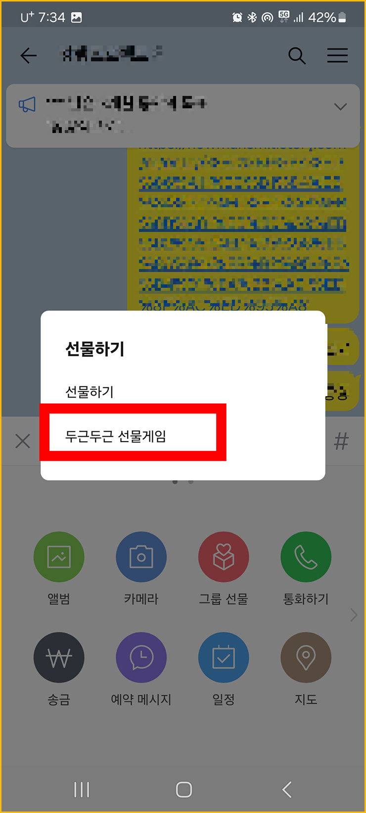 03. 두 가지 선택지가 나옵니다. 선물하기와 두근두근 선물게임이 있습니다. 선물하기는 우리가 평소에 생일 때 보내는 것과 동일합니다. 두 번째 위치한 <두근두근 선물게임>을 눌러주세요.