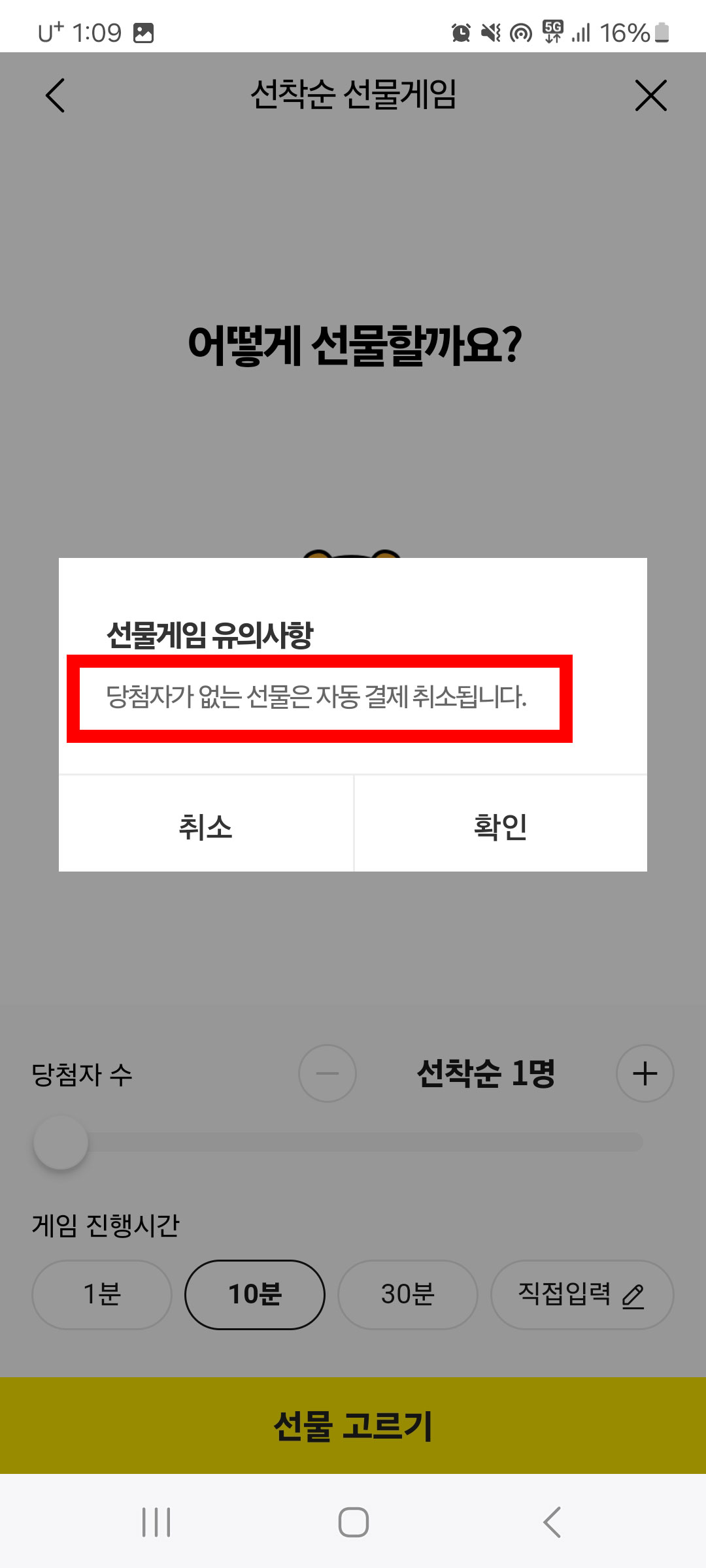 06. <선물고르기>를 누르면 유의사항이 나옵니다. 만약에 시간 내에 아무도 상품을 얻지 못할 시에는 자동 환불 처리가 됩니다. 근데 보통 시간 내에 다 가져가더라고요.