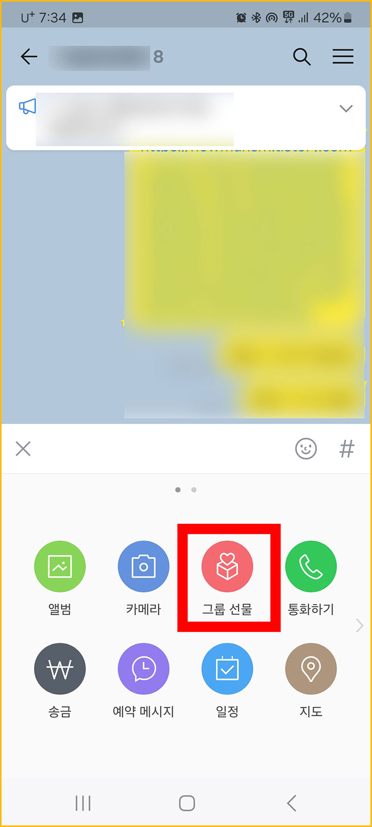02. 닫혀 있던 창이 열리면서 여러 가지 기능들이 있습니다. 이 중에서 우리는 선착순 선물게임을 할 것이니까, <그룹 선물>에 들어가주세요.
