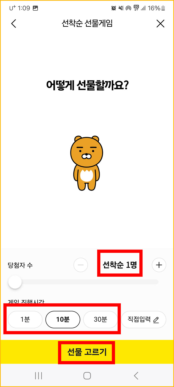 05. 선착순으로 받을 인원수를 정해야겠죠? 여러분들이 원하는 <인원수>를 골라주세요. 저는 보여드리기 위해서 1명으로 선택을 했습니다. 그 다음에는 <진행 시간>을 정해주세요. 근데 의외로 1분으로 해도 금방 당첨이 됩니다. 저는 넉넉하게 10분으로 해놓았습니다.