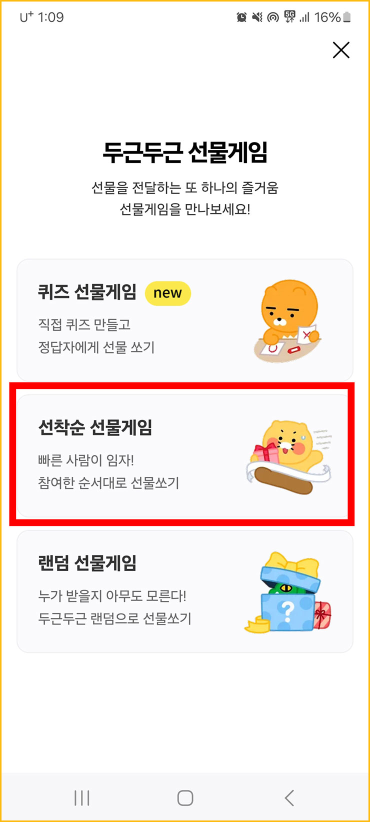 04. 퀴즈 선물게임 / 선착순 선물게임 / 랜덤 선물게임으로 총 세 가지 선택지가 있습니다. 두 번째에 있는 선착순 선물게임을 눌러주세요. 선착순이기 때문에 먼저 선물게임에서 버튼을 누른 사람이 여러분들이 지정한 선물을 얻는 방식입니다.