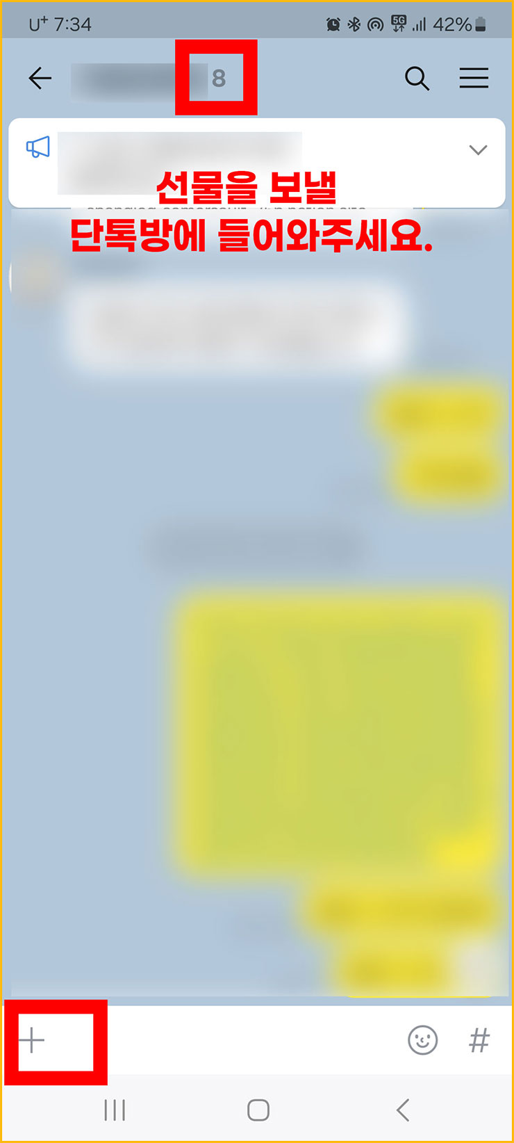 01. 먼저 선착순 선물게임을 할 <톡방>을 하나 들어가주세요. 저도 제가 좋아하시는 분들이 있는 톡방에 들어왔습니다. 선착순 게임이다 보니, 최소 본인 포함 톡방에 3명 이상 있어야 합니다. 그리고 아래에 보면 <플러스> 아이콘이 있습니다. 해당 아이콘을 눌러주세요.