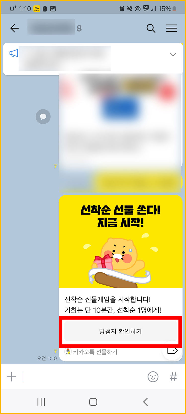 08. <결제>까지 완료가 되었으면 톡방에 톡이 하나 올라오는 것을 확인할 수 있습니다. 누가 당첨이 되었는지 궁금하잖아요. <당첨자 확인하기>를 눌러주세요.