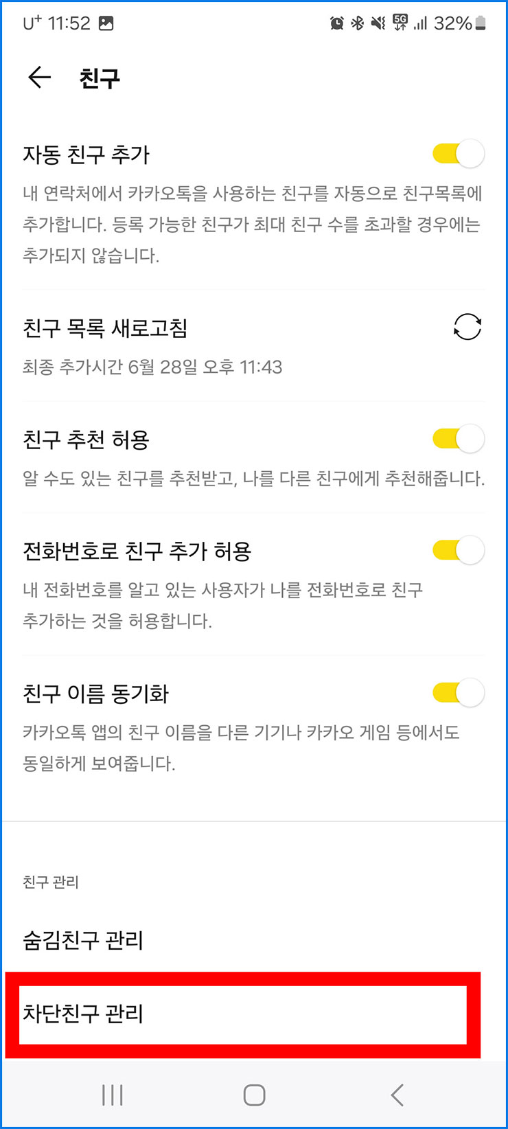 09. 친구 관련 설정창이 나옵니다. 아래에 보면 <차단친구 관리> 항목이 있습니다. 해당 항목을 눌러주세요.