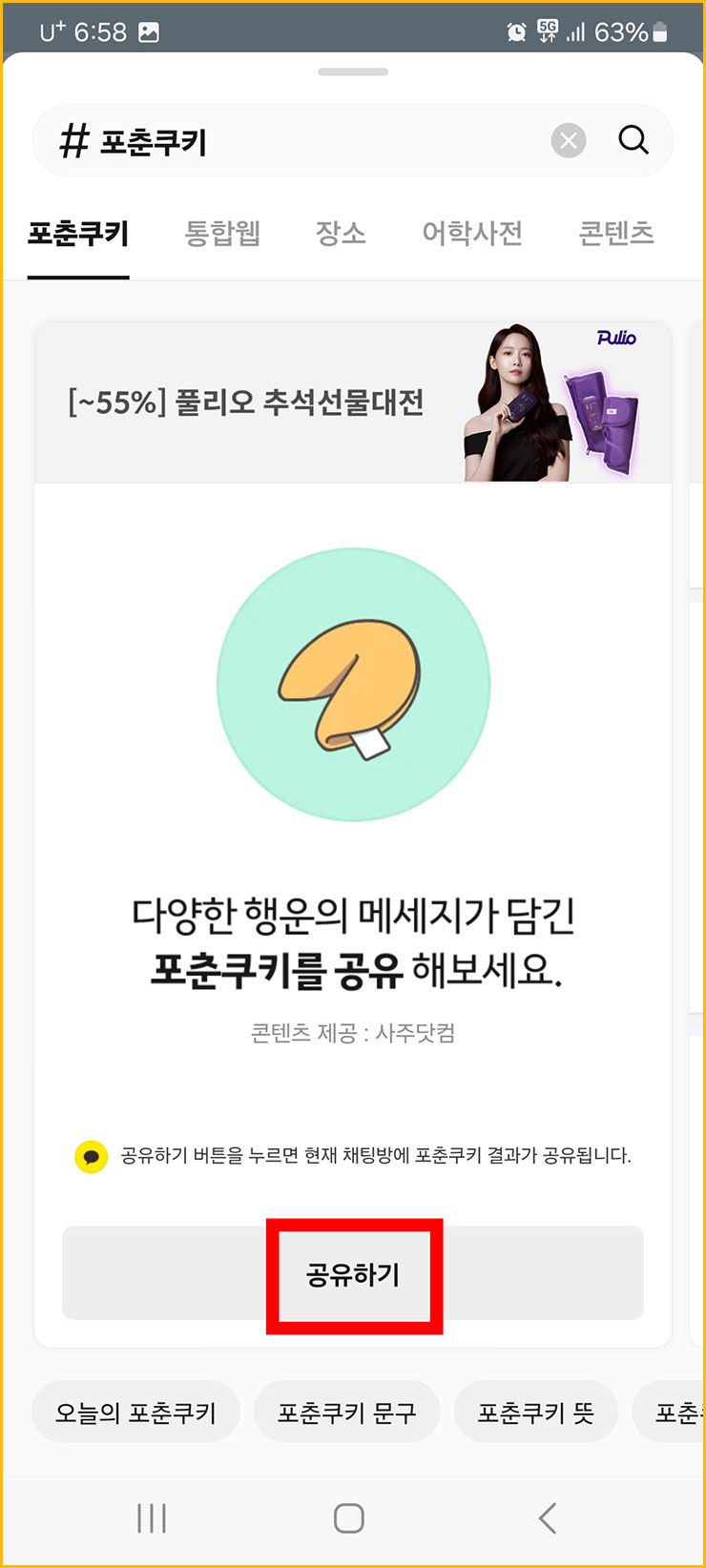 오늘은 저와 함께 카톡 포춘쿠키 프로그램 여는 법에 대해서 알아보았습니다. 의외로 간단하지 않나요? 여러분들은 어떤 결과가 나왔을지 궁금하네요. 카톡에서 나온 오늘의 운세가 여러분들 하루 동안 도움이 될 수 있는 내용이 나왔으면 좋겠습니다.