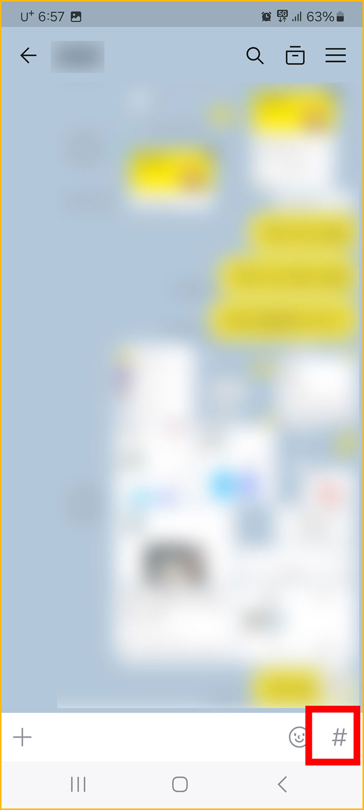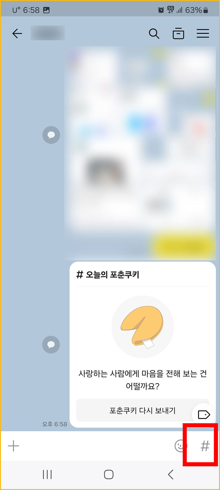 01. 먼저 카톡 어플을 열어주세요. 그리고 <아무 톡방>에 들어가주세요. 개인적으로는 자신과의 대화 톡방에 들어가는 걸 권장해드립니다. 그 다음에는 아래에 있는 <해시태크>를 눌러주세요.