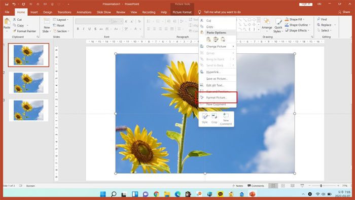 우클릭을 해서 그림 서식창을 꺼내서 변경하는 법이 있고, 파워포인트 상단에 있는 메뉴바에서 변경하는 방법도 있습니다. 이 방법 알아두면 좋을 거 같아서 함께 알려드리겠습니다.