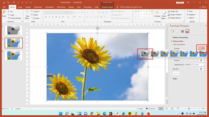 혹여 채도값을 눌러서 바꾸기 번거롭다고 느끼시는 분들은 파워포인트가 가지고 있는 프리셋을 이용해서 바꿀 수도 있습니다. 글쓴이도 사실 이 방법으로 피피티 속 사진이나 이미지를 흑백으로 바꿉니다.