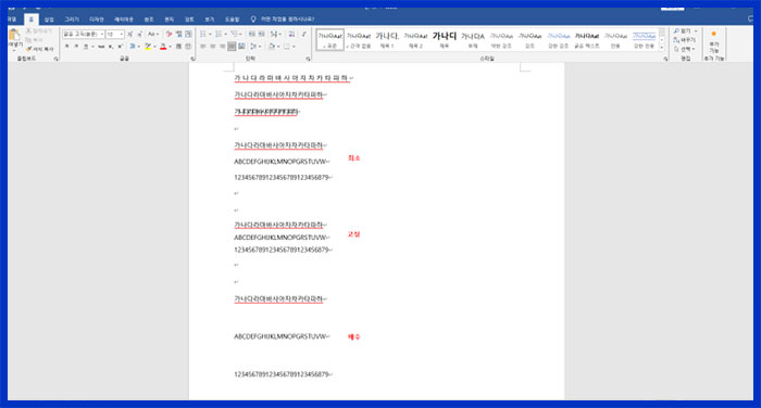 우선 MS 워드 자간(글자 사이에 간격)을 조절하는 법부터 설명해드리겠습니다. 만약에 행간(줄 사이의 간격) 조절을 원하시는 분께서는 조금 아래로 스크롤을 내려주세요.