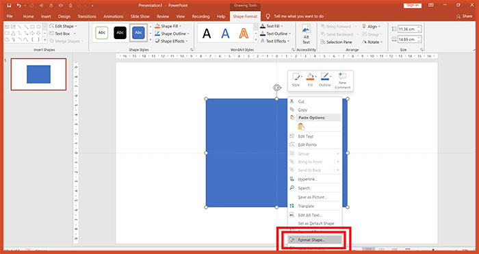 02. 그 [도형]을 선택한 다음에 [우클릭]을 한 다음에 여러 탭들 중에서 아래에 위치한 [도형 서식]을 선택해주세요.